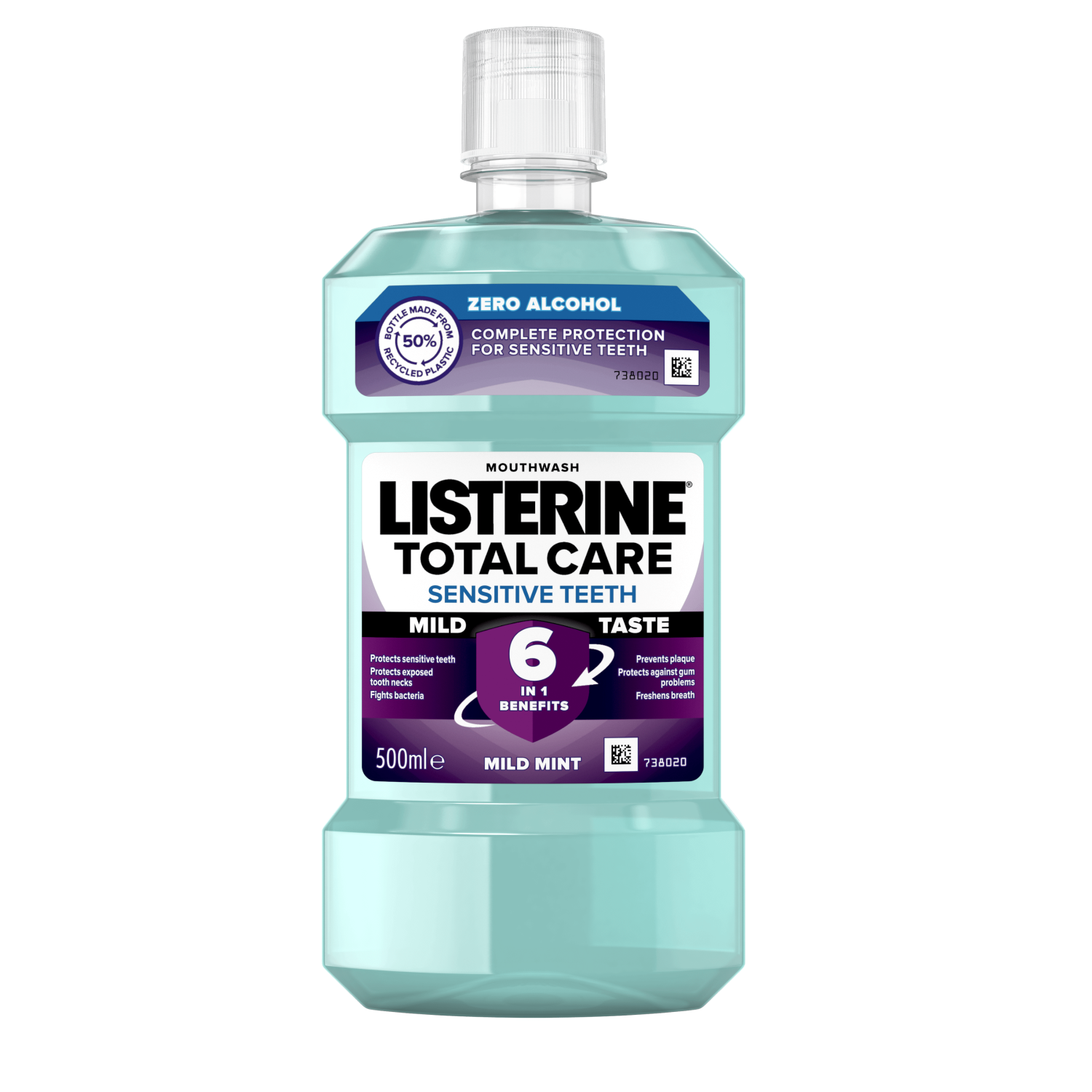 LISTERINE® TOTAL CARE SENSITIVE TEETH je ústna voda z rady LISTERINE® s komplexnou ochranou citlivých zubov a účinkom 6 v 1.